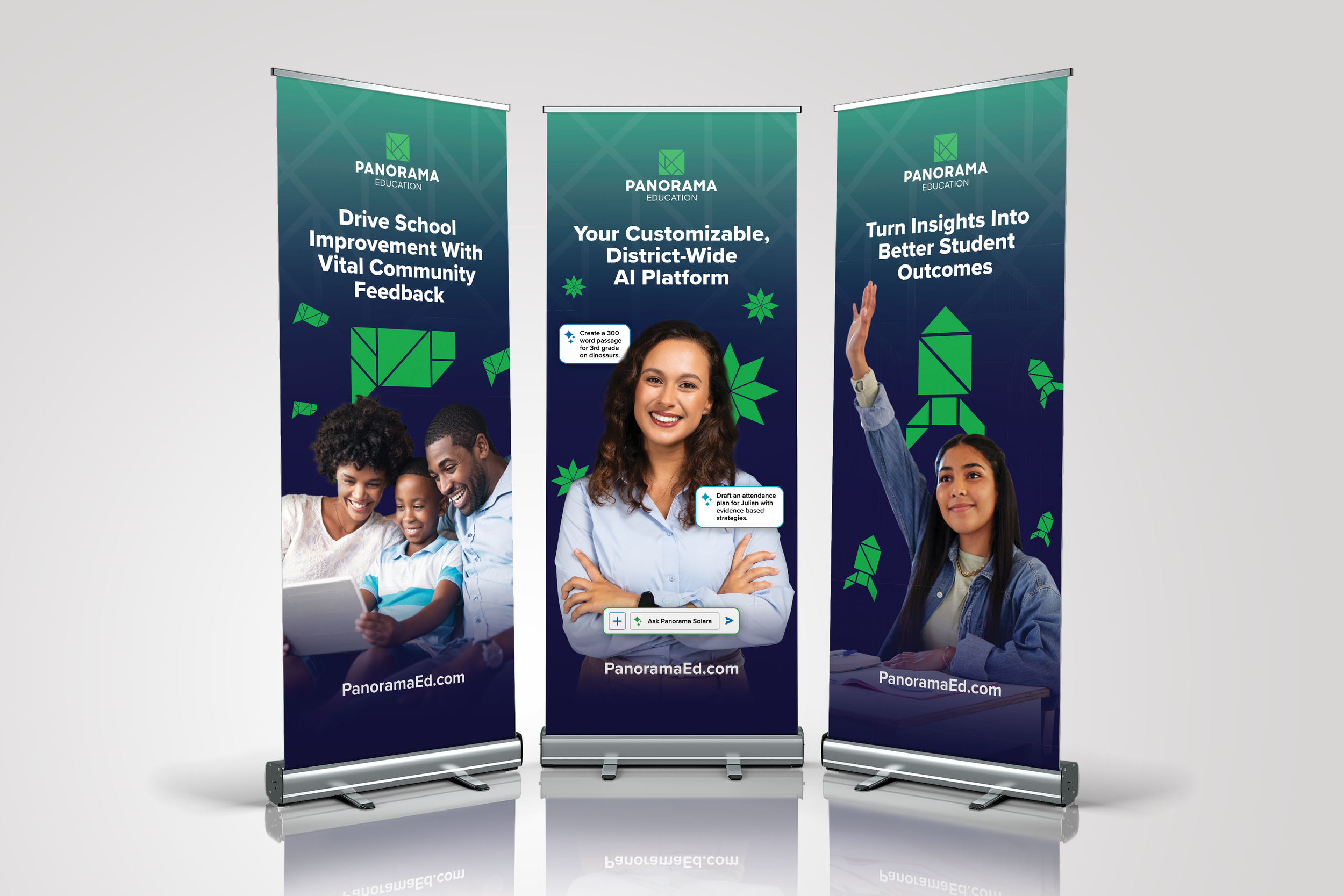 Challenge: Create a set of newly branded event banners to co-exist with branded hotel key card design for customers and partners collaborating and visiting Panorama Education at in person events.